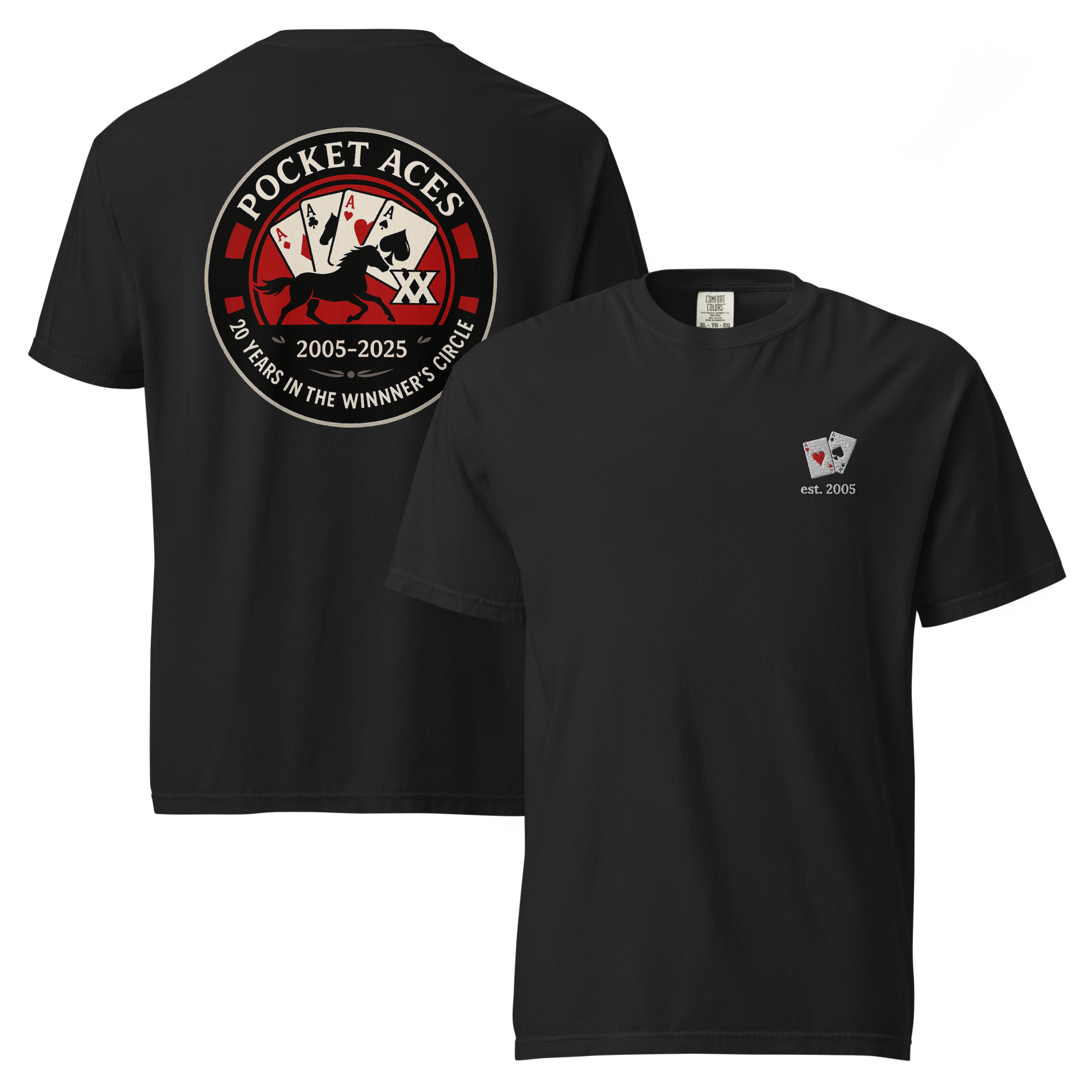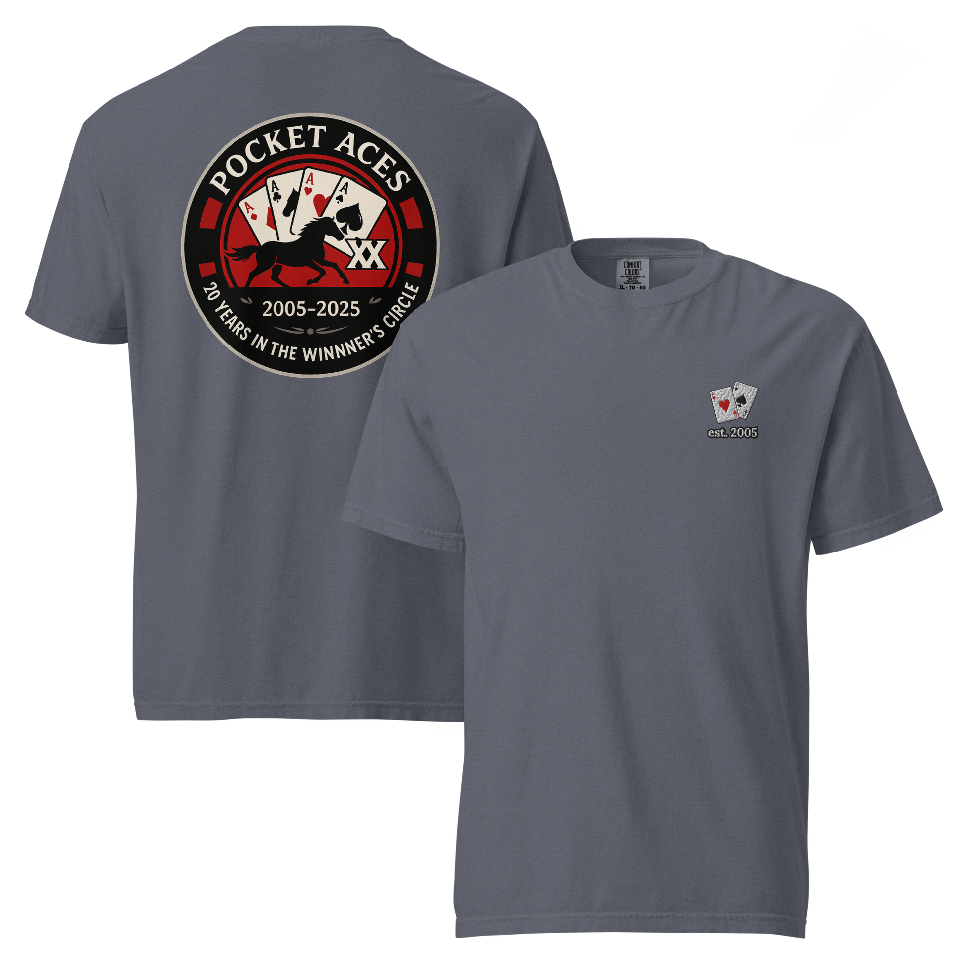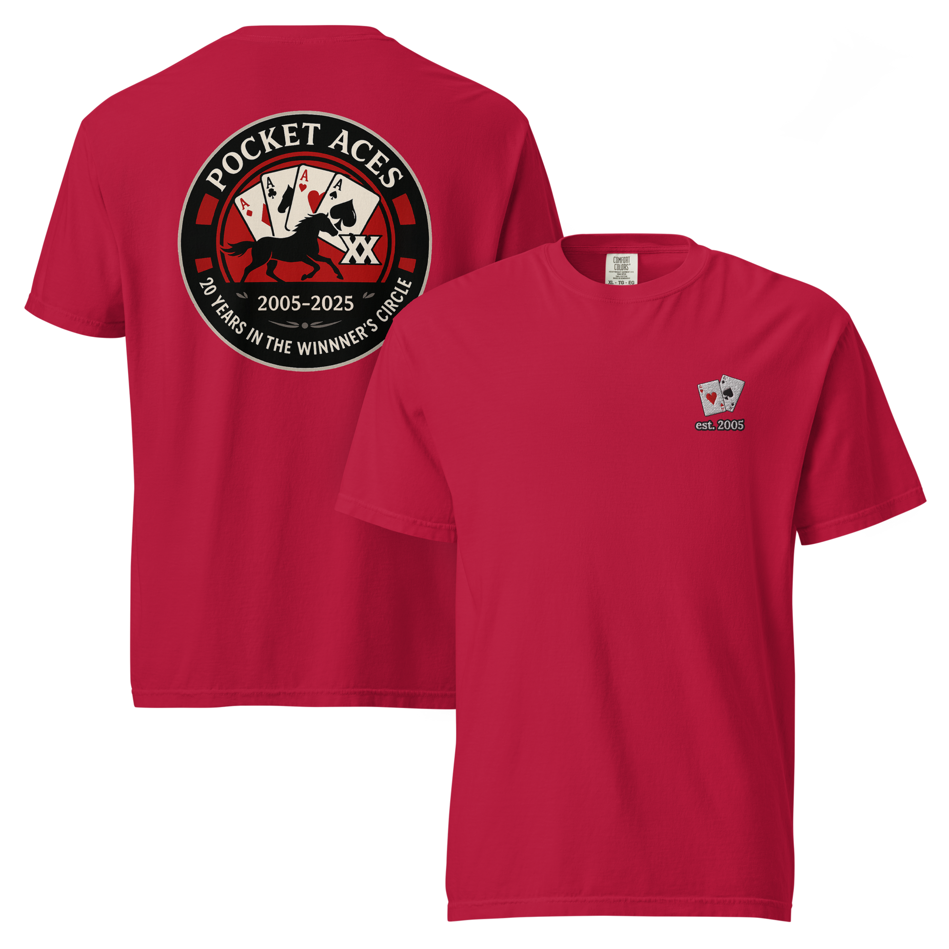 Two decades in the Winner’s Circle! This front-embroidered, back-printed tee is one of a special release of designs celebrating Pocket Aces Racing’s 20th anniversary in September 2025. Made from 100% ring-spun cotton, it delivers a thick, structured feel that’s still soft, breathable, and built to last. With six brand-new designs made just for this milestone, it’s the ultimate way to rep your syndicate in ace-level style.
