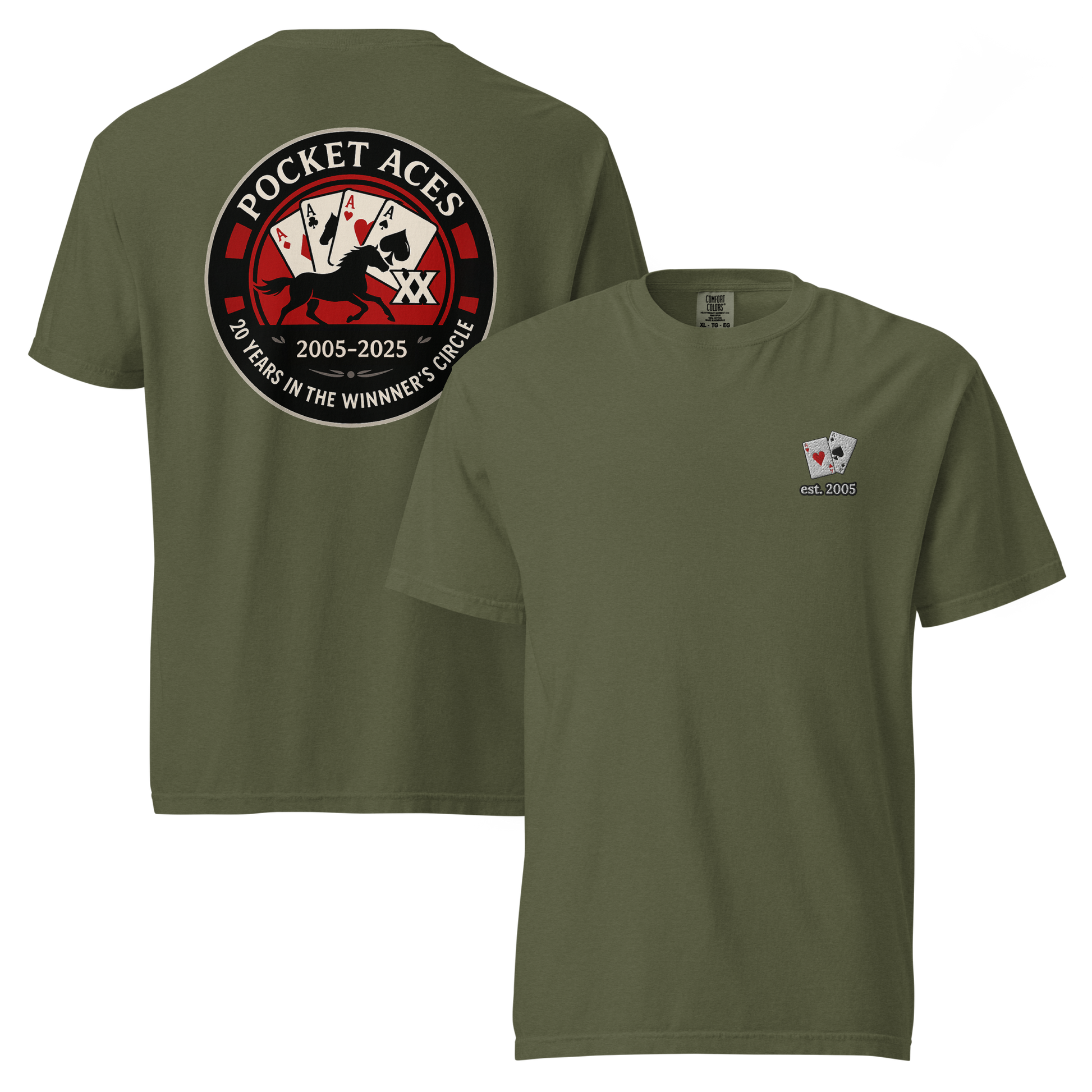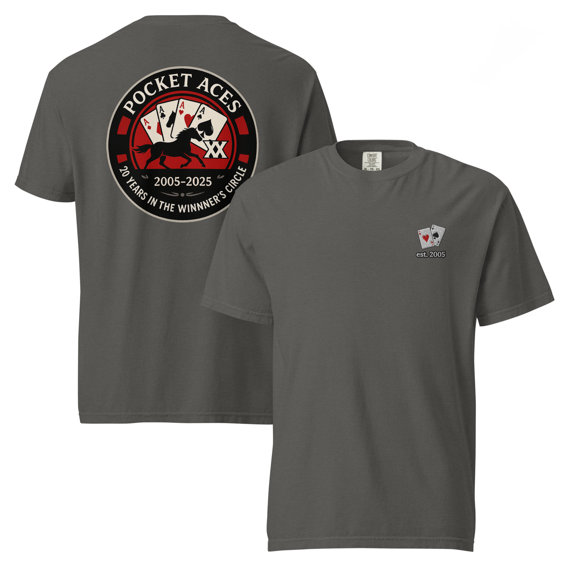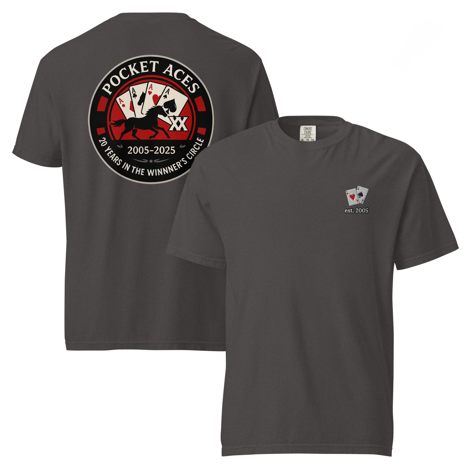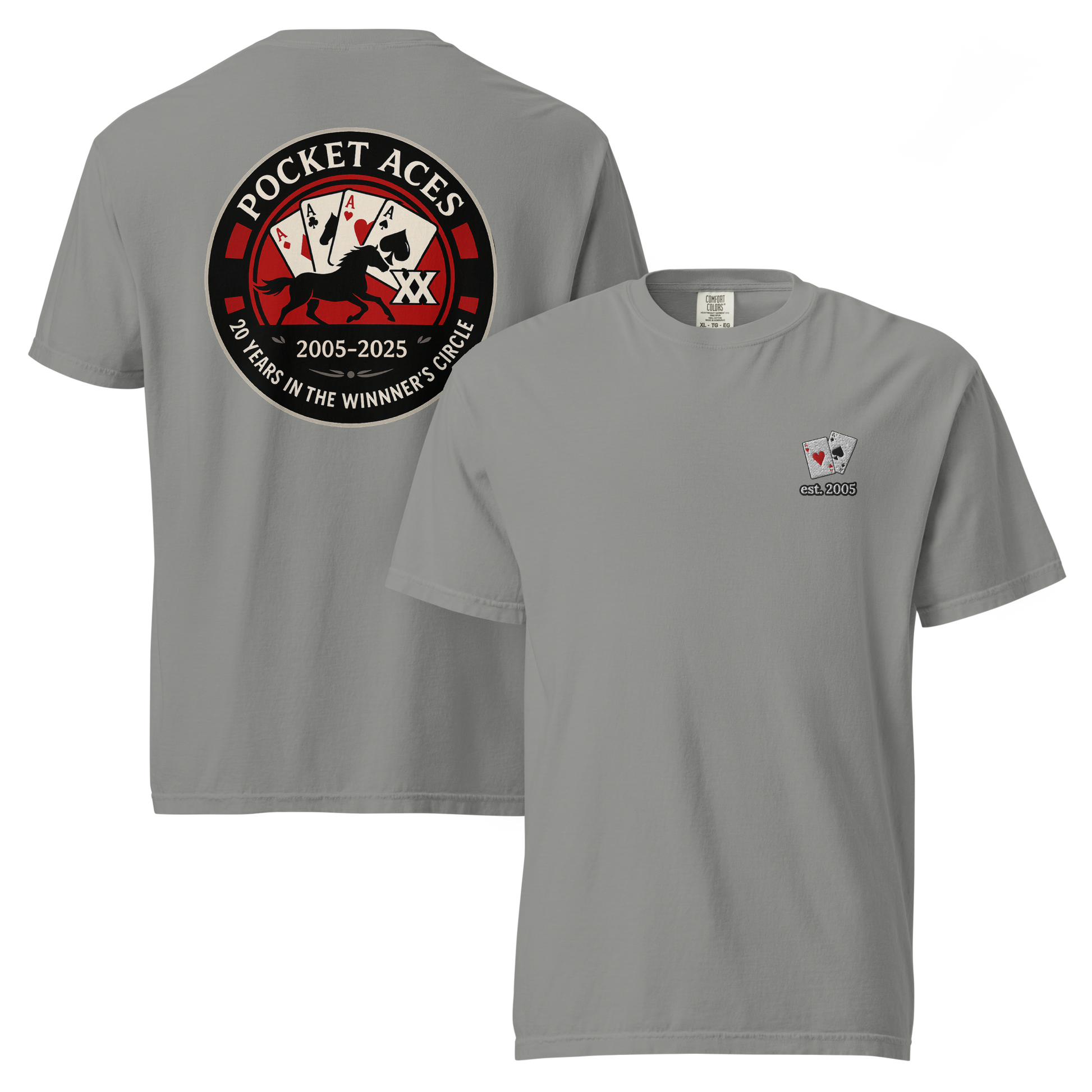 Two decades in the Winner’s Circle! This front-embroidered, back-printed tee is one of a special release of designs celebrating Pocket Aces Racing’s 20th anniversary in September 2025. Made from 100% ring-spun cotton, it delivers a thick, structured feel that’s still soft, breathable, and built to last. With six brand-new designs made just for this milestone, it’s the ultimate way to rep your syndicate in ace-level style.